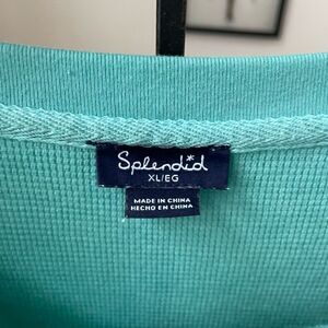 Splendid brand dip dye thermal, long sleeve top that is banded at the waist and cuffs like a sweatshirt but not fleece on the inside. Cotton and polyester blend. Shades of green, blue and wipes. Laying flat measures 27 inches shoulder to hem and 24 inches armpit to armpit.