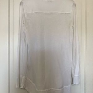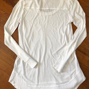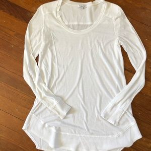 White Splendid long sleeved top. Scoop neck, waffle knit shoulders, cuffs & peplum. 98% cotton 2% spandex. Pit to pit 17”. Length 30”. Sleeve 25 1/2”.