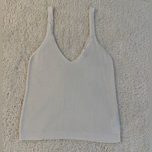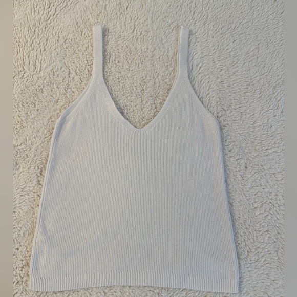 Soft ribbed knit tank with a V-neckline. Slim straps and a clean, minimal silhouette. Easy-to-wear neutral layer for casual outfits.