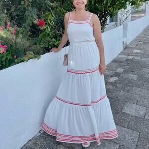 Romantic maxi dress square neckline, trimmed in red rick rack with cascading full tiered ruffles for a fit and flare style. Boho, bohemian, cottagecore, tomatoegirl, romantic, feminine, fairy vibes. Perfect for special occasions, birthday, wedding guest, vineyard, summer event, date, engagement party, winery, wedding shower, dinner date