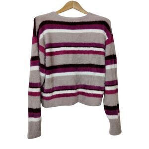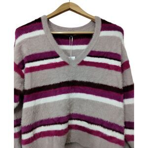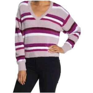 Splendid Women's Fuzzy Striped V-Neck Pullover Sweater Size L Purple NWT