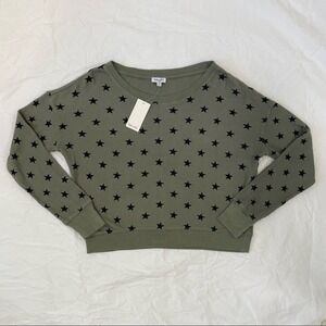 New with tag attached, never worn. Splendid women's long sleeve top. Olive/army green with black star pattern. Slightly boxy fit. Soft thermal style fabric (materials: cotton, modal, spandex). See photos for measurements and more details.