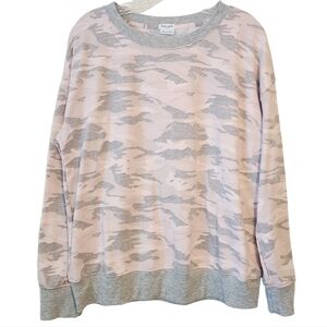 Perfect transition piece for the cooler months. Women's light pink and gray camouflage print crewneck sweatshirt by Splendid, size large. Ribbing at grey trim. Soft sweatshirt is a blend of polyester and elastane.