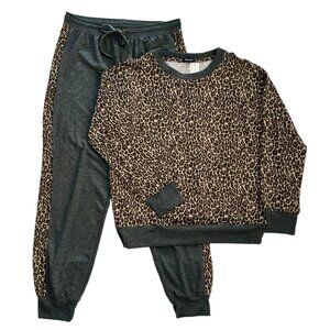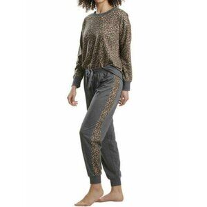 Splendid gray, brown and beige lively leopard 2-piece pajama set (top and joggers) - Crew neck top with long sleeves - Jogger pants with drawstring elastic waist