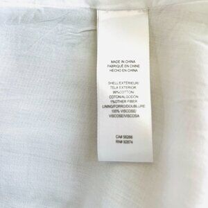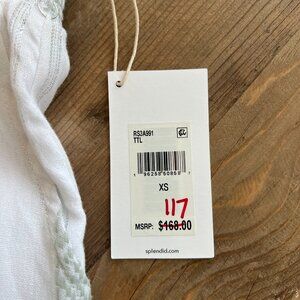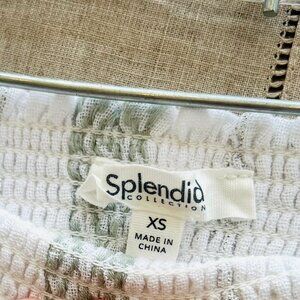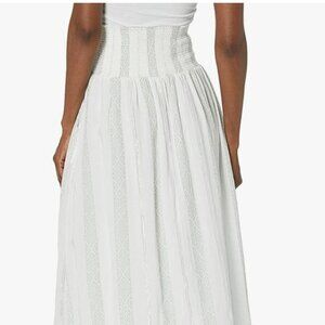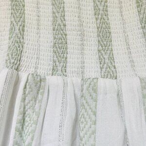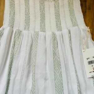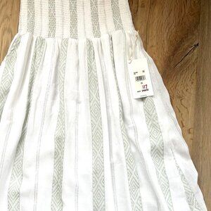 Smocked elastic, pull on, high waist midi skirt with side pockets. This Splendid skirt is new with tags, never worn. The skirt is white with green pattern, and subtle, but beautiful metallic silver vertical stripes. Made with breathable soft fabric for easy movement. This skirt is suitable for a party, night out, or a casual daytime look. The fabric is 99% cotton/1% other. Machine wash.