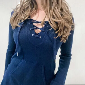 The traditional henley gets an upgrade in this hooded lace front version in navy. Check out other listings for other items pictured including home decor.