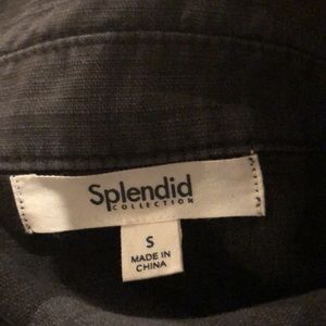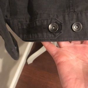 Excellent condition gray wash lightweight jean jacket with camo lining. Breast pockets, side pockets , adjustable button tab. Contrast darker gray strips on pockets and sides.