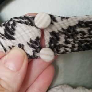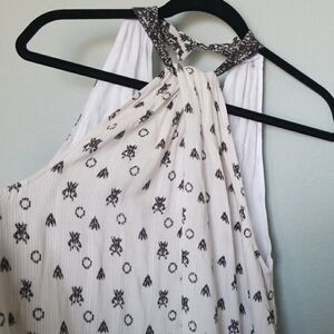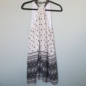 Back has a V opening and a 2 button closure behind the neck. Super cute twist detail at the neck in front. Cream colored with darkbrown/ black design. Boho / tribal inspired print? Dress is fully lined. 100% rayon. Excellent condition.