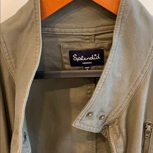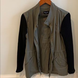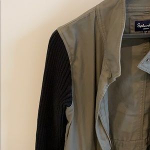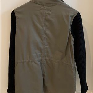 Army green thin utility jacket with black sweater sleeves, drawstring waist, super cute!