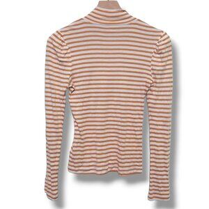 Splendid mock-neck long-sleeve t-shirt. Puff shoulder. Tan and white thin horizontal stripes.