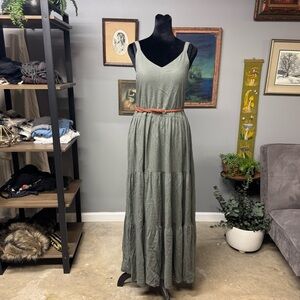 Splendid olive green tiered maxi dress. V neck front with adjustable straps. Dress has small belt loops. No belt included. Viscose and linen blend.