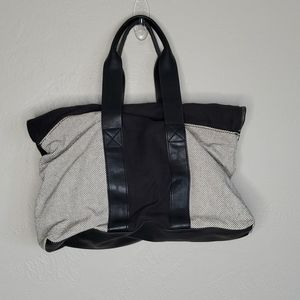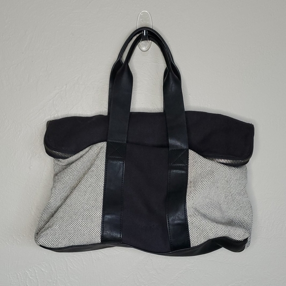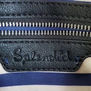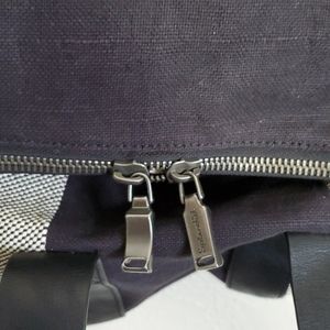 Leather handles. Striped inside. Large inner pockets. Zipper flap. Magnetic closure.