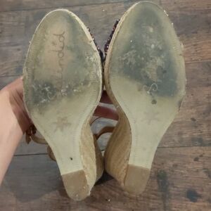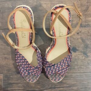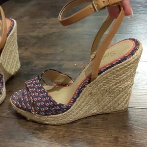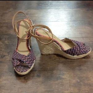 These splendid wedges are perfect for summer. Super comfortable with fabric at the toe and adjustable ankle strap. In good used condition.