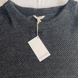 Splendid (Brand new with tag)women’s black with silver threads knit sweater. Sporty with a lil flash crew neck, long sleeve black and grey stripe banding at waist and cuffs. 73% cotton, 22% polyester, 3% metallic blend.