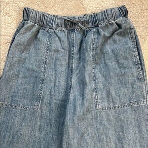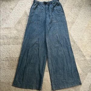 Stylish wide-leg denim pants. Features an elastic waistband for comfort. Perfect for casual wear.
