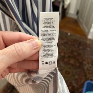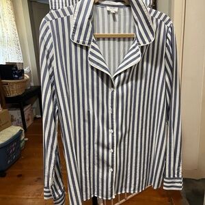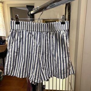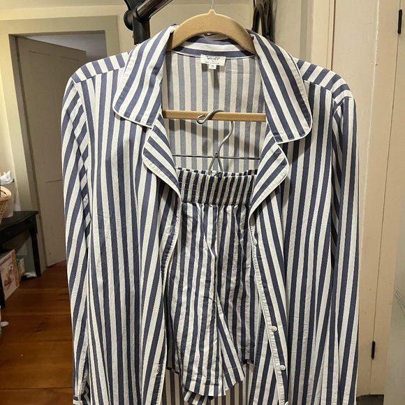 Great condition. Size medium. Blue and white stripe. High waisted and Elastic waist shorts. The button up shirt is missing one button, the button is included for sewing back on.