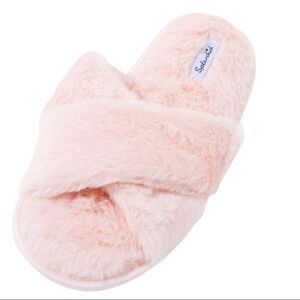 New with tags Slip On Crossover Faux Fur Slippers by Splendid. Pink. These super-cozy washable slippers feature an open toe slide-on design with puffy crossover strap detail. Grippy rubber bottoms.