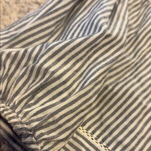 Chic top with gray and white stripes. Features a stylish design. Good condition