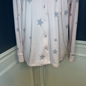 Super soft, stretchy, cozy, wrinkle free and stylish. This Splendid set was worn once and although beloved, was the wrong size for me. I hope someone can enjoy it! Fabric: Mid-weight brushed jersey Star pattern and piped trim Collared neck and notched lapels Long sleeves Button placket Covered elastic and drawstring closure at waist Patch breast pocket Shell: 95% polyester/5% spandex Wash cold Imported, China
