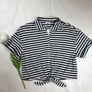 Splendid-Navy & White Stripe tie front shirt. Classic navy/white striped shirt with a cute tie front. Cropped design with roll up sleeve. Pair it with white jeans or wide leg for a trendy look.