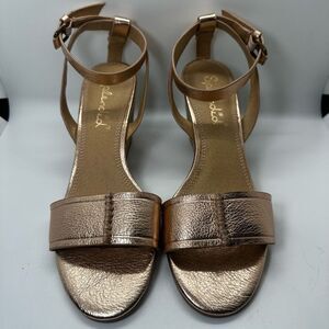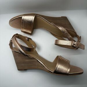 he Splendid Tadeo Rose Metallic Leather Wedge Sandals look just as good with denim as they do with a dress! Supple, metallic, genuine leather shapes these chic wedges with a single toe-strap, with tooled accents and seamed detail. Matching adjustable strap wraps around the ankle and has a leather-wrapped strap at the heel. Antiqued gold hardware.