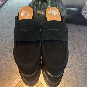 Size 9.5. New. Some price sticker residue on the footbed. Elevate your look with a soft suede clog lifted by a faux-woodgrain platform and chunky block heel for retro-chic vibes. 4 1/2" heel; 1 1/2" platform Moc toe Suede upper Lightly cushioned footbed Block heel Platform sole Leather upper/textile lining/synthetic sole Imported