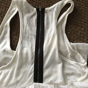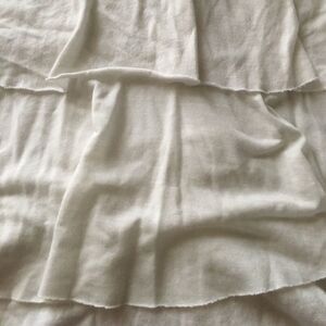 Super cute white tank made from rayon & polyester. Zipper in the back. 5 layers of ruffles. Small hole in bottom layer can easily be stitched. Not noticeable wearing. Worn once. Strap to bottom hen ~25". Pet & smoke free home.
