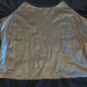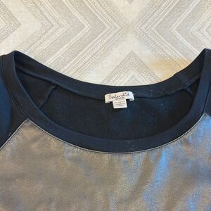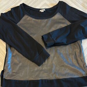 Splendid Women’s Black and Gray Faux Leather Long Sleeve Sweatshirt - Size M. Chic metallic silver and black top. Ideal for a modern look. Gently worn. 19” pit to pit and 22.5” shoulder to front hem. Side slit.