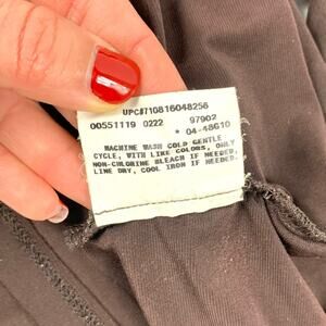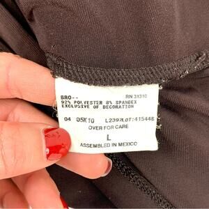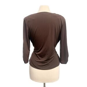AB Studio brown wrap ruched top, v neckline, 3-4 sleeves with ruching detail at sleeve hem, flattering fit, front lining, has stretch, displayed on size medium (8-10) dress form, overall good preowned condition, can be dressed up or down