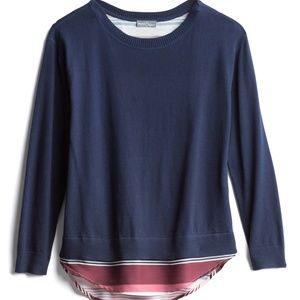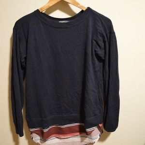 Navy blue split back sweater with sewn in striped under shirt.