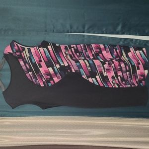 Sleeveless mini dress with split color with one side black and the other side pink, white, purple and teal pattern. Smoke and pet free home.