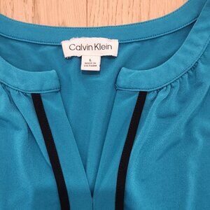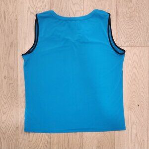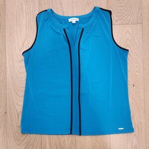 Calvin Klein split V stretchy knit shell in teal lagoon with black piping. Like New. 21" across chest, 22" L