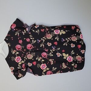 Black top with red, yellow and green florals all over. Lightweight fabric, doesn't stretch. Flutter sleeves. Great condition. Split neck. Minimally sheer. Great for the office. Please note this item does have a perfume-y scent. I washed with scent free detergent however the scent remains. Office, workplace, brunch, professional, career, dinner, date night, romantic, sweet, feminine, dainty, moody floral,