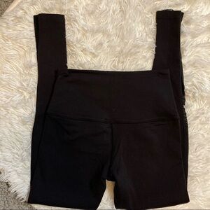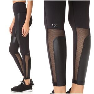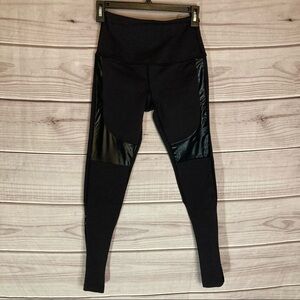 In excellent used condition no rips, tears or stains. No rips, tears or stains. Black ankle length leggings, high rise high waisted, contrasting faux leather detailing and contrasting fabric panels with mesh. Elasticized waistband.