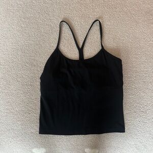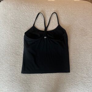 Sleek black tank top. Racerback design. Perfect for workouts.
