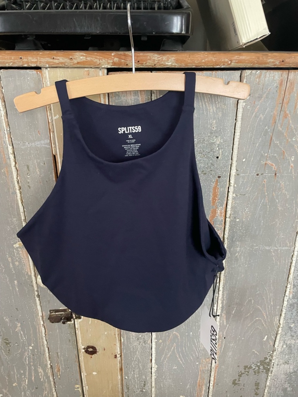 Sleek navy workout tank with a high neckline. Racerback style for freedom of movement. Lightweight, breathable fabric ideal for training or layering. Side adjustable detail for a tailored fit.