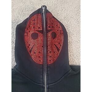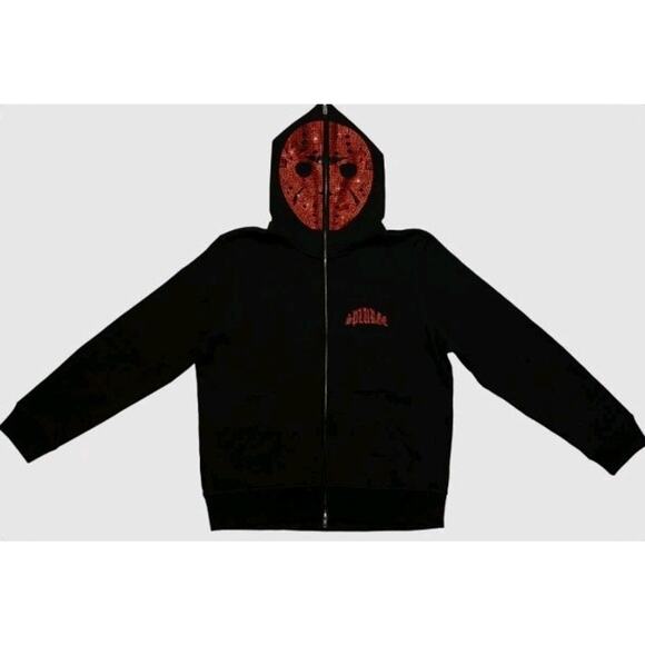 This unique Splurge On X hoodie is a must-have for any anime lover or streetwear enthusiast! Featuring a bold red rhinestone hockey mask graphic, this full-zip hoodie combines edgy style with comfortable warmth. Whether you're into anime, rare fashion finds, or simply love standout pieces, this hoodie is sure to make a statement.
