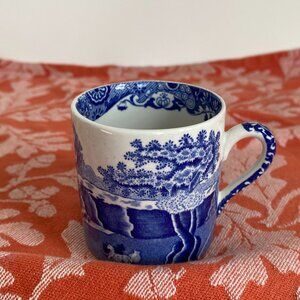 The Spode Blue & White C 1816 P Mini Coffee Mug is a vintage porcelain piece made in England with an Italian design. This round mug has a capacity of 4 oz and features a glossy finish with a blue and white Italian Countryside pattern. Perfect for all occasions, this dishwasher and microwave-safe mug is a timeless piece that keeps cold or hot for 2 hours and is part of the Victorian style collection by Spode. Made in the early 19th century using traditional pottery production techniques, this collectible item is both stylish and practical for everyday use.