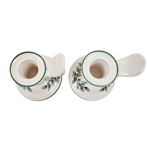 Add a touch of classic holiday charm to your home with these retired Spode Christmas Tree Candlestick Holders, featuring a convenient finger loop design. Perfect for collectors and enthusiasts seeking a timeless decorative piece.