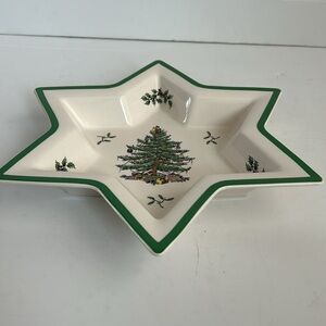 Great condition Spode England Christmas Tree cream w green trim star shaped serving dish. Christmas tree in center, holly, mistletoe.