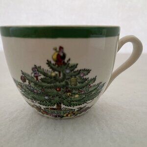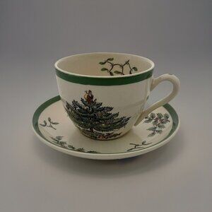 This is a Spode Christmas Tree tea cup and saucer set, featuring the iconic Christmas Tree pattern with green trim. This set is designed for the Christmas occasion. It includes a tea cup and saucer, perfect for holiday gatherings or festive celebrations. A replacement set for the Spode S3324 collection.