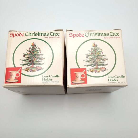 Spode England Vintage Christmas Tree Low Candle Holders Set Holly Berries - 2″