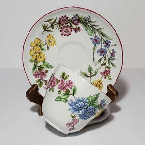 Vintage Spode teacup and saucer in pattern Romany. Pink, blue and yellow flowers. Made in England. Pink trim on cup and saucer.