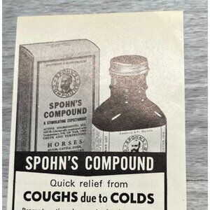 A charming remnant of veterinary history, this classic advertisement for Spohn's Compound highlights its long-standing reputation as a stimulating expectorant for horses, mules, cattle, and dogs. Promising quick relief for coughs due to colds, it touts 75 years of trust from trainers. Printed in Goshen, Indiana by Spohn Medical Company, this piece serves as a nostalgic glimpse into past equestrian care.