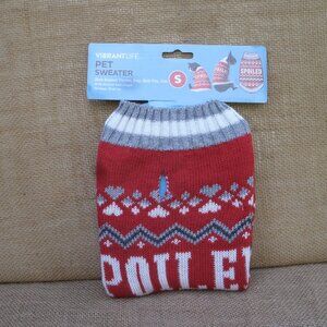 Pet sweater in red, white, & gray. Says "Spoiled", with heart and zigzag design. Size S. For dogs 10 to 20 pounds, and cats. 13 inches back length. Vibrant Life brand. Machine washable. New with tags, never used. Great for walks on cool days. tags: pet sweater, dogs, cat, spoiled, small dogs, pet gear, outdoor, cute, animal