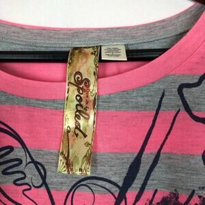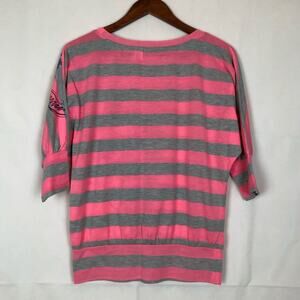 Spoiled women's striped top in pink and gray. Round neck. Dolman elbow sleeves. Floral print with beads. Banded bottom hem. Relaxed fit. Worn only a few times. In good used condition.