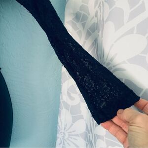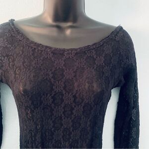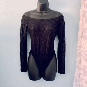 Cute sheer black lace bodysuit. Scoop neck. Wear on or off shoulders. Long sleeve. Cheeky bottom. Snap closure. No