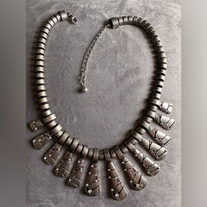 This shiny, retro-style necklace has metal lines interspersed with long, thin silver-tone rectangular shapes on a cord finished with smaller rings.