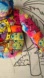 Vibrant puffer jacket with cartoon graphics. Features a mix of bright colors.