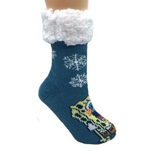 Material: 50% Acrylic, 50% Polyester (Shell)/100% Polyester (Lining/Sole); Made with recycled fibers • Care: Machine washable • Country of Origin: Imported • Includes: 1 pair of slipper socks • Size: Shoe size 4-10 fits most • Features: Women's Slipper Socks; Holiday-inspired SpongeBob SquarePants Design; Knit Outer; Faux Fur Sherpa Lining; Bottom Grippers